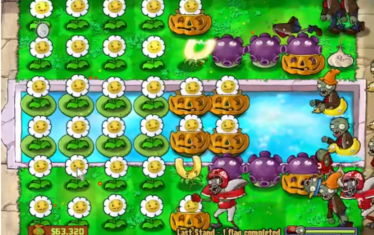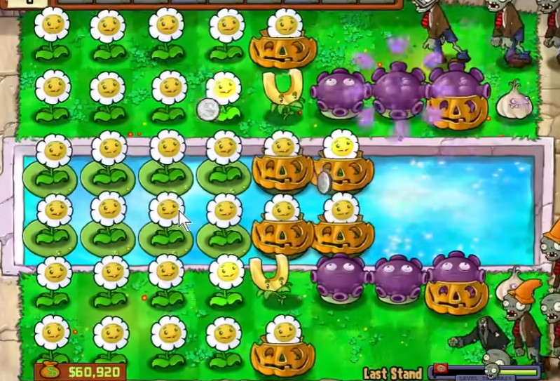 一套成熟的阵法布局可以完全利用初始的5000阳光。常见的做法是在泳池关卡的第二排和第四排各种植三个忧郁菇作为主力输出,并在它们前方放置大蒜,将六条行进的僵尸引导至这两条火力线上。阵型的后方则全部种植金盏花以最大化金币产出,并为金盏花套上南瓜头保护。吸金磁放置在阵型中间位置以便吸收全屏金币。这样的布阵完成后,通常只需在每波间隙补充被消耗的大蒜和修复南瓜头即可,能够稳定挂机收获大量金币。