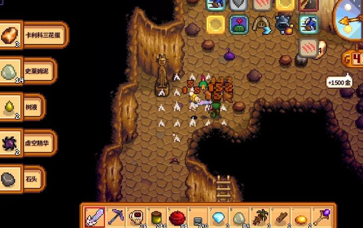 骨头山洞的内部构造与你熟悉的普通矿洞有很大不同,它没有理论上的层数上限,这意味着你的探索可以无限深入。洞内没有用于保存进度的电梯,所以每次离开后再次进入,都必须从第一层重新开始你的冒险。在每一层中,你需要通过敲碎石头或击败怪物来找到通往下一层的梯子。有时你还会发现一些深不见底的洞口,跳下去可以让你随机跳过3到15层,这能大大加快下潜速度,但也会让你损失相当于跳过层数三倍的生命值,不过这个跳跃过程永远不会让你的生命值低于1点,所以不必担心会直接摔死。