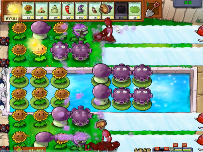 游戏开始时,应优先在场地后两排种植向日葵,快速建立阳光优势。早期出现的僵尸压力可以利用土豆雷和窝瓜这两种低成本的一次性植物进行化解。对于最先出现的制造冰道的蓝色雪橇僵尸,必须优先解决,可使用窝瓜或土豆雷直接秒杀,防止冰道蔓延压缩种植空间。水上区域初期可以放置水草来应对潜水僵尸。