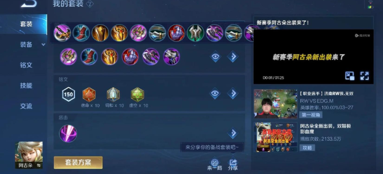 阿古朵的核心出装围绕提升坦度与团队增益展开,一套常见的打野出装为巨人之握、影忍之足、霸者重装、极寒风暴、不死鸟之眼和反伤刺甲,这套装备能极大增强生存能力,铭文可选择宿命、调和、虚空以强化防御属性。另一套侧重清野速度的出装则将鞋子换为疾步之靴,铭文搭配狩猎、心眼、梦魇以获得法穿效果,加快前期发育节奏。作为打野时,阿古朵凭借被动技能可以快速放生野怪,开局反野或快速清空自家野区是建立优势的关键。