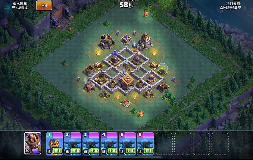 进入核心区域后,在蓝胖集群面对多头地狱塔、单头地狱塔或连弩时,及时释放冰冻法术控住关键防御,同时在部队密集处开启狂暴,最大化蓝胖的范围输出。治疗法术需在蓝胖被多重防御集火、血量快速下降时使用,配合弹跳法术让部队绕过城墙死角,持续向大本营推进。三王需同步跟进,蛮王抗伤、女王点杀关键防御、咏王提供光环与无敌,进一步提升推进稳定性。