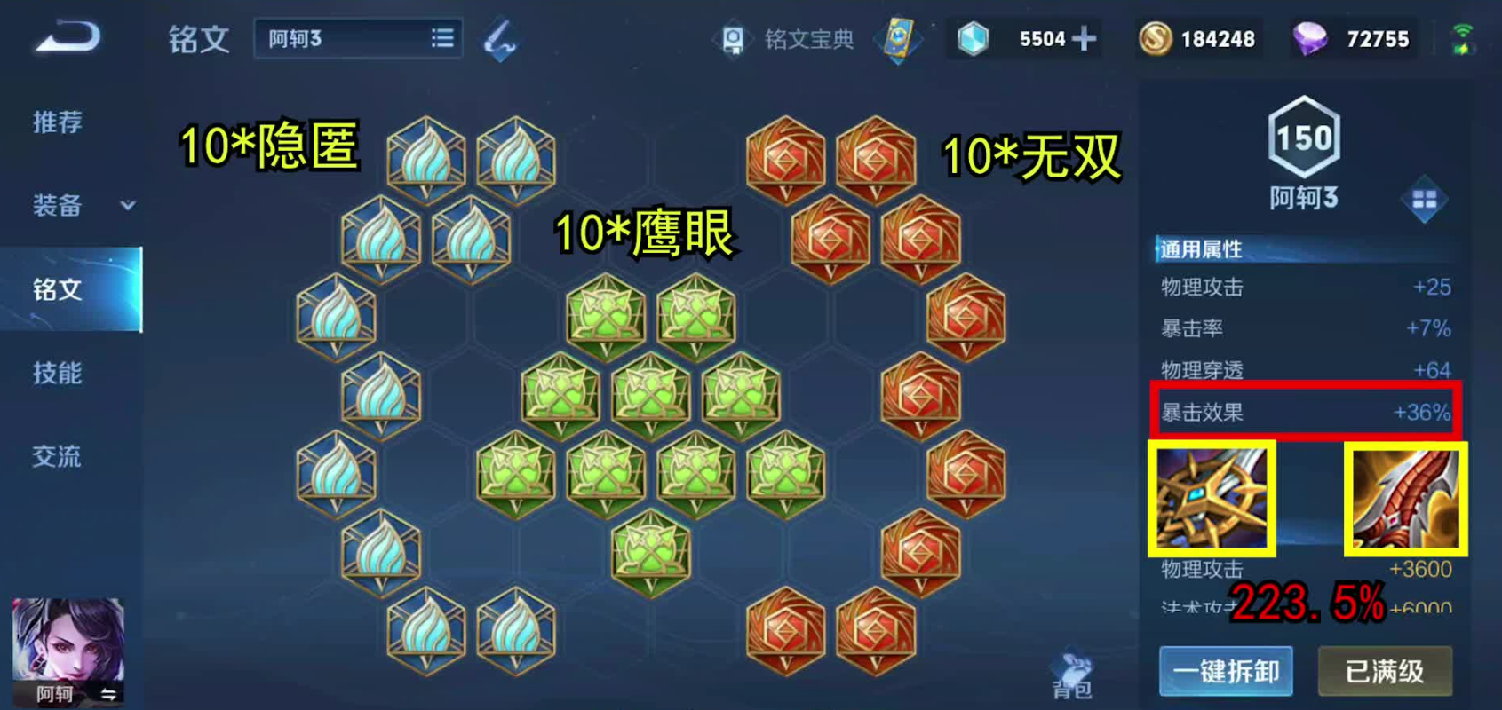 铭文搭配10狩猎、10鹰眼、5祸源5异变,狩猎提升移速与攻速,方便带线拉扯;鹰眼保证物理穿透;祸源与异变兼顾暴击与稳定伤害,适配逆风出装的平衡定位。逆风局切忌贪输出、盲目开团,核心是稳住发育、拖到装备成型,依靠这套出装的容错与爆发,在后期团战找准时机切C,完成逆风翻盘。