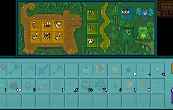 松鼠化石是任务中最复杂的部分,包含腿骨、尾巴、脊柱、肋骨和颅骨五种碎片。腿骨和尾巴可通过挖掘场的骨头矿或淘金获得,概率分别为10%和20%;脊柱和肋骨需在挖掘场骨头矿或姜岛南部挖蚯蚓,概率分别为1.35%和25%;颅骨则需通过铁匠铺开启金椰子获取,概率为14%。金椰子可通过摇树、沙漠拾取或绿洲商店周一购买获得,建议优先收集以解锁颅骨化石。