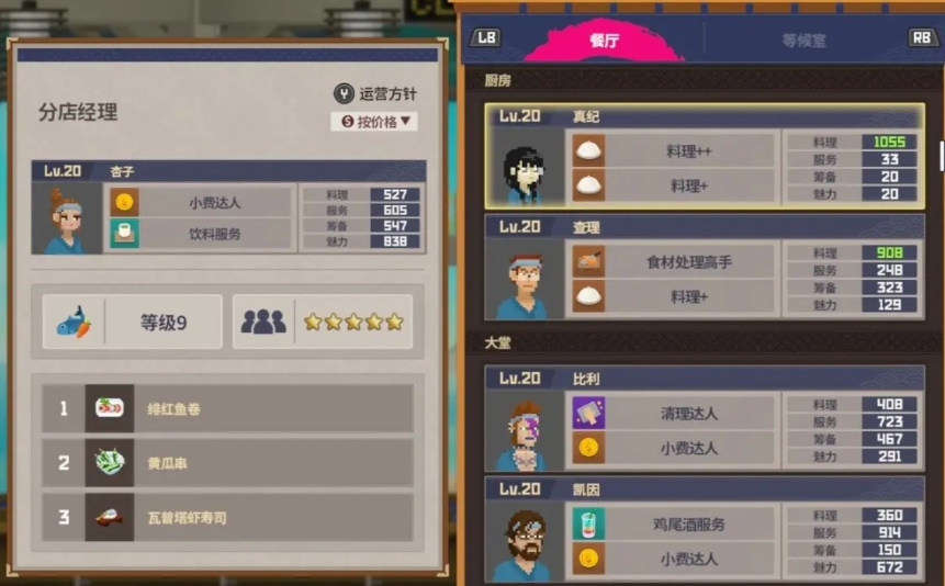 分店经理等级的提升直接决定了分店等级上限,这是游戏中的核心机制之一。分店等级与经理等级挂钩,最高可达到9级,而经理需要达到15级才能将分店提升至最高等级。经理的料理属性数值是关键指标,当该数值超过500时,分店将解除所有食材使用限制。分店等级不仅影响经营规模,还决定了可发往分店的食材等级上限,这两者是相互独立的系统。