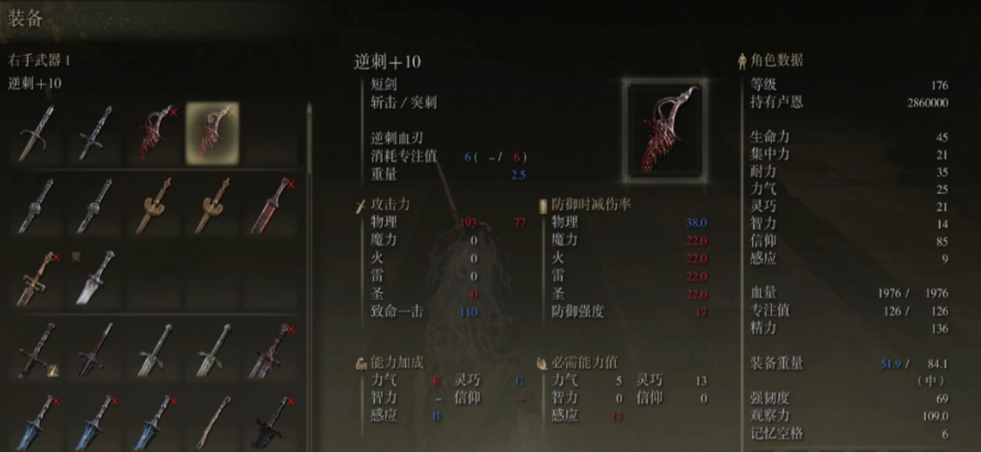 虽然匕首攻速快、暴击率高,但要注意它们的攻击力和攻击距离是短板,需要灵活走位和连续攻击才能发挥最大效果。双持匕首的玩法曾经很强力,但现在强度有所下降,更推荐搭配各种战灰来增加战斗乐趣。匕首在面对多个低韧性小怪时表现优异,但对抗大型BOSS可能会比较吃力,这时候可以考虑切换其他武器。