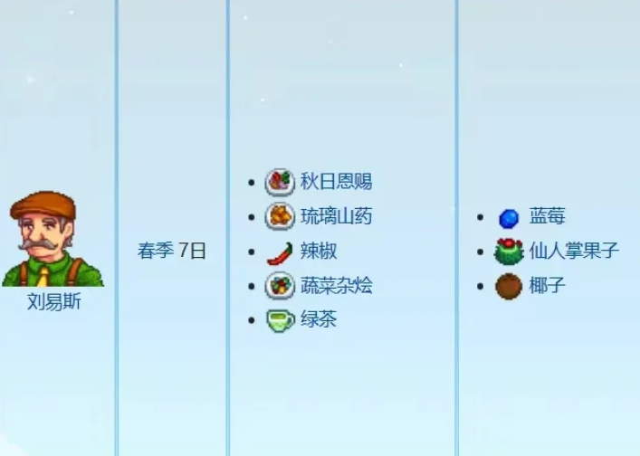 村长的生日是春季第7天,这可是游戏里第一个过生日的NPC,刚开局的小伙伴可能会手忙脚乱。他最喜欢的礼物是辣椒、琉璃山药和秋日恩赐,但辣椒得等到夏天才能种,第一年春天可能来不及准备。防风草和椰子他也很喜欢,这些容易搞到的东西也能让他开心。如果赶上生日送他最爱的东西,好感度会涨得飞快哦!